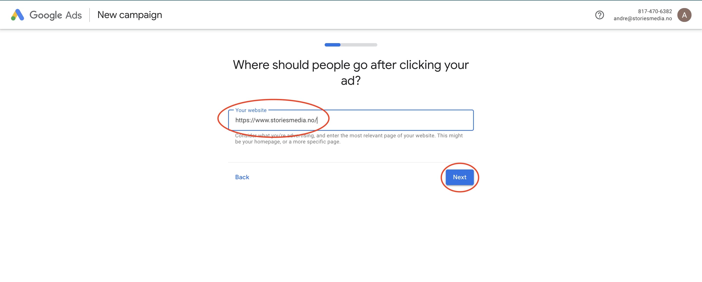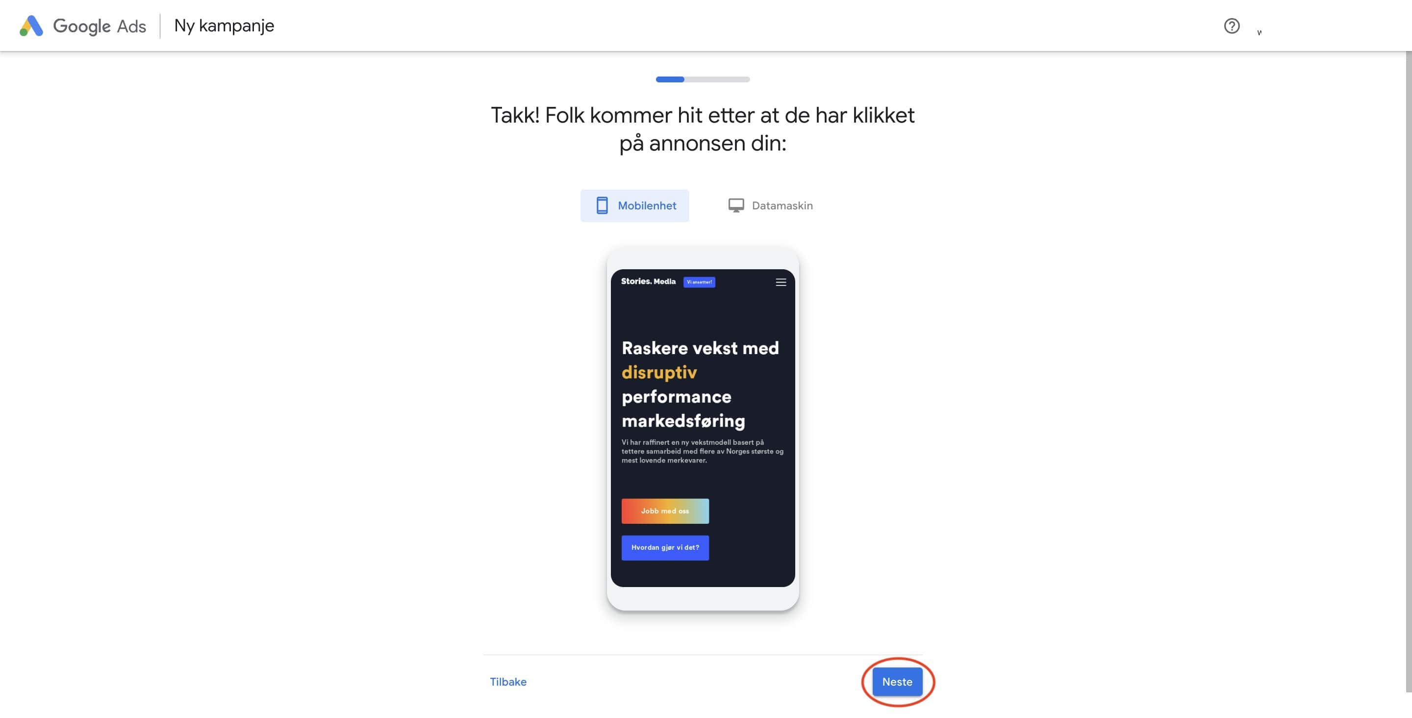 Nå har du kommet til det steget hvor du skal lage selve annonsen og velge hvilken side brukerne skal lande på etter de har trykket på annonsen din.