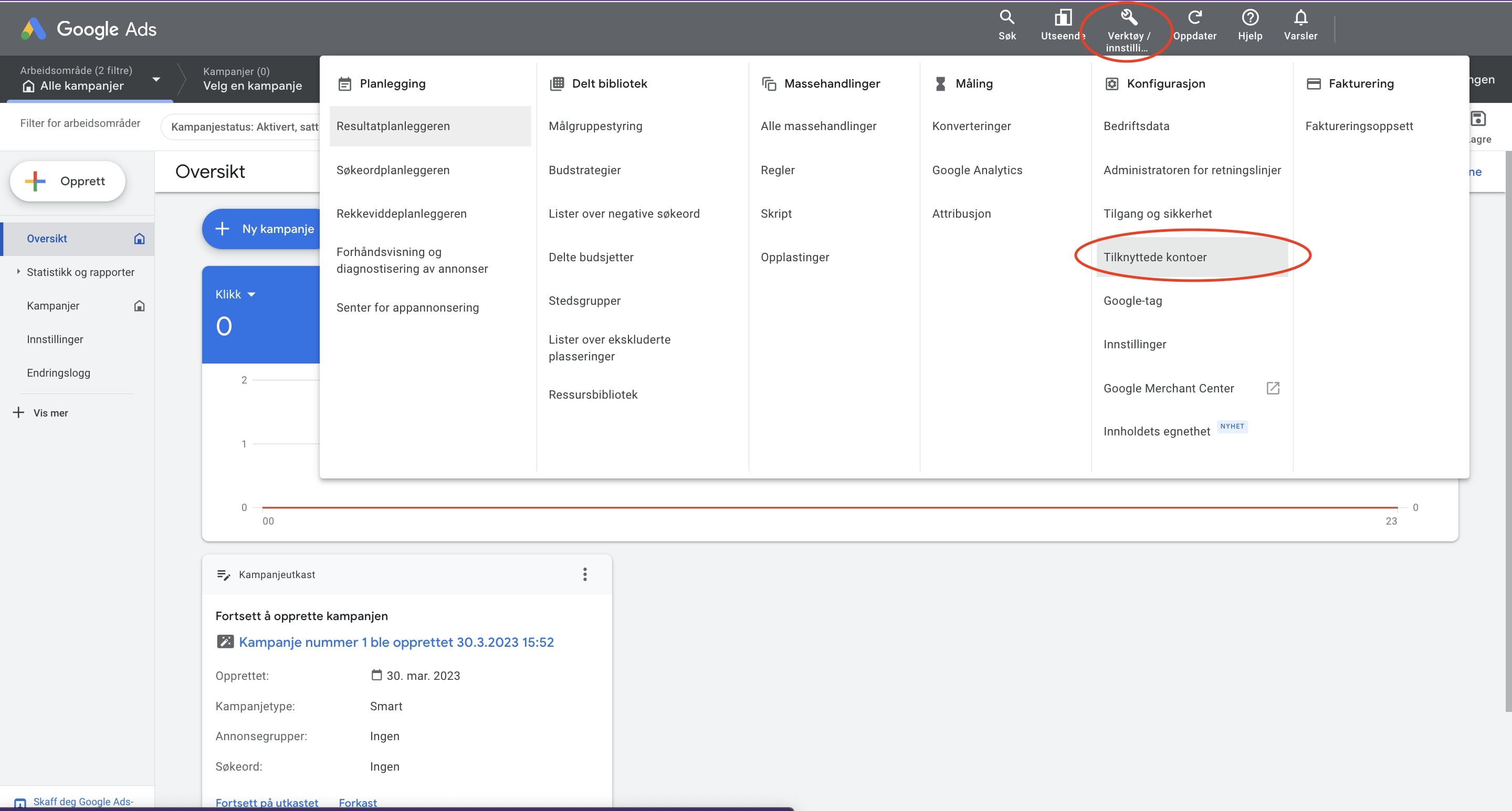 Nå som du har importert konverteringer og funnet en liste med søkeord du vil bruke i annonseringen, er det på tide å sette opp selve kampanjen. I denne delen vil vi se nærmere på hvilke innstillinger og konfigurasjoner du bør velge, for at kampanjen din skal ha et best mulig utgangspunkt.