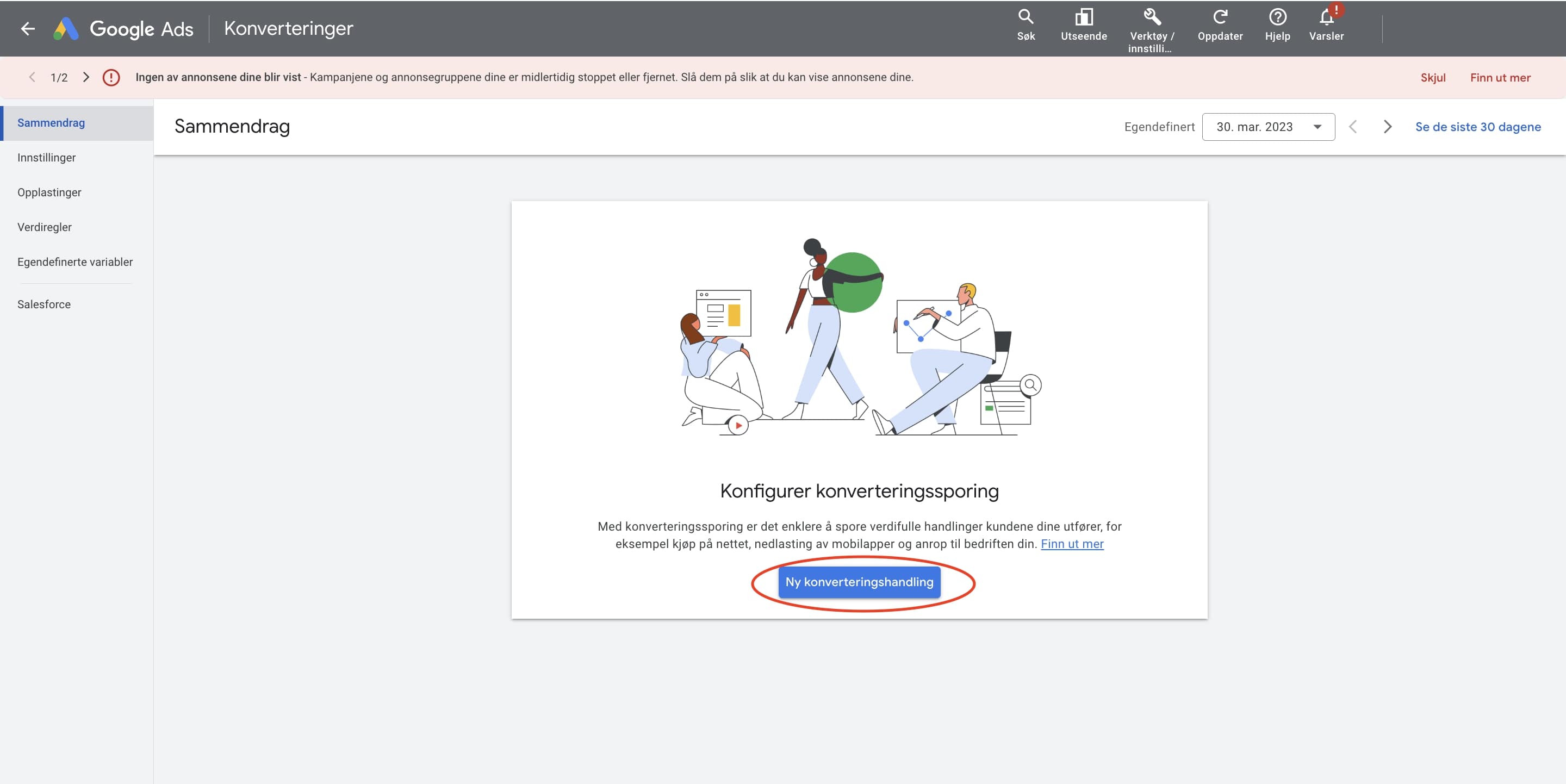 Har du ikke satt opp konverteringssporing i kontoen, kan du likevel bare fortsette å slavisk følge stegene i denne guiden. Under 5. Endre budstrategi kan du lese mer om hva du kan gjøre hvis dette er tilfelle.