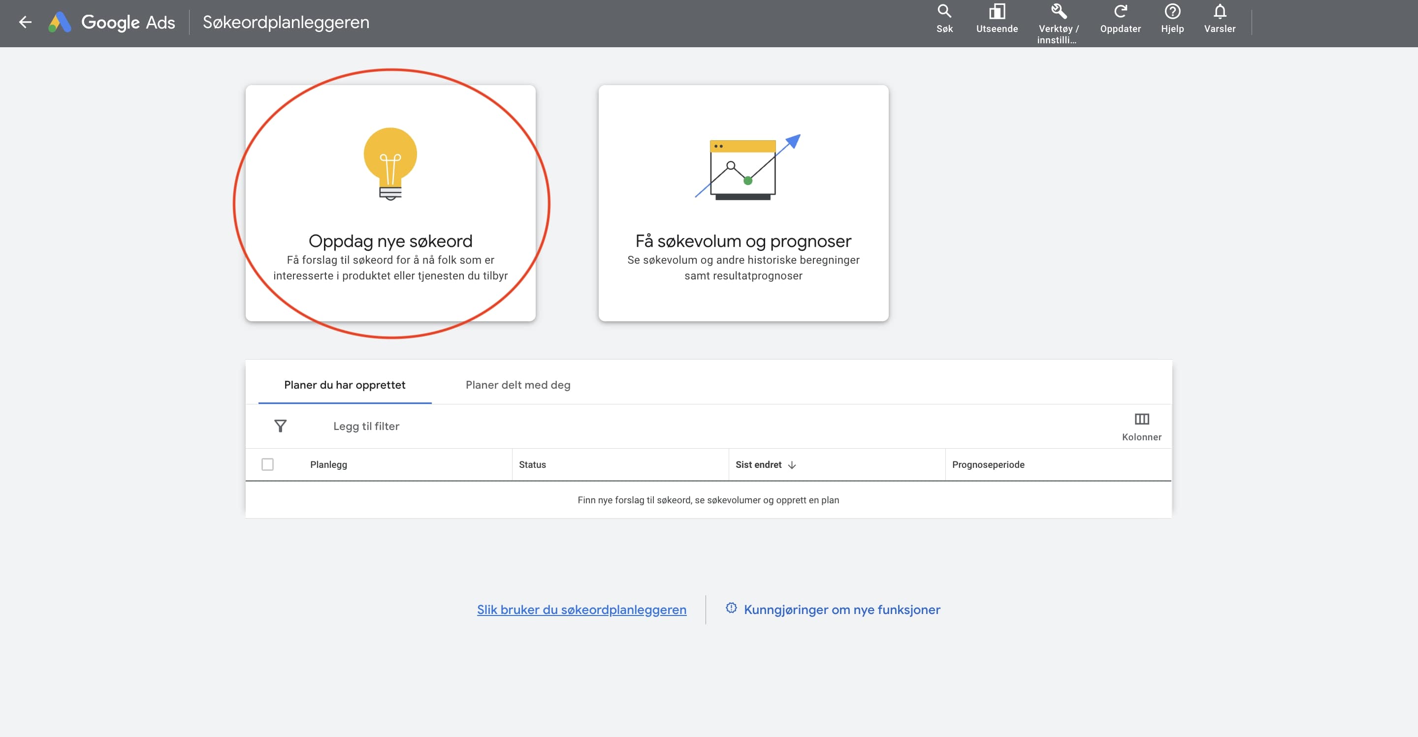 Heldigvis har Google Ads et innebygd verktøy for å hjelpe deg med dette, som heter Søkeordsplanleggeren.