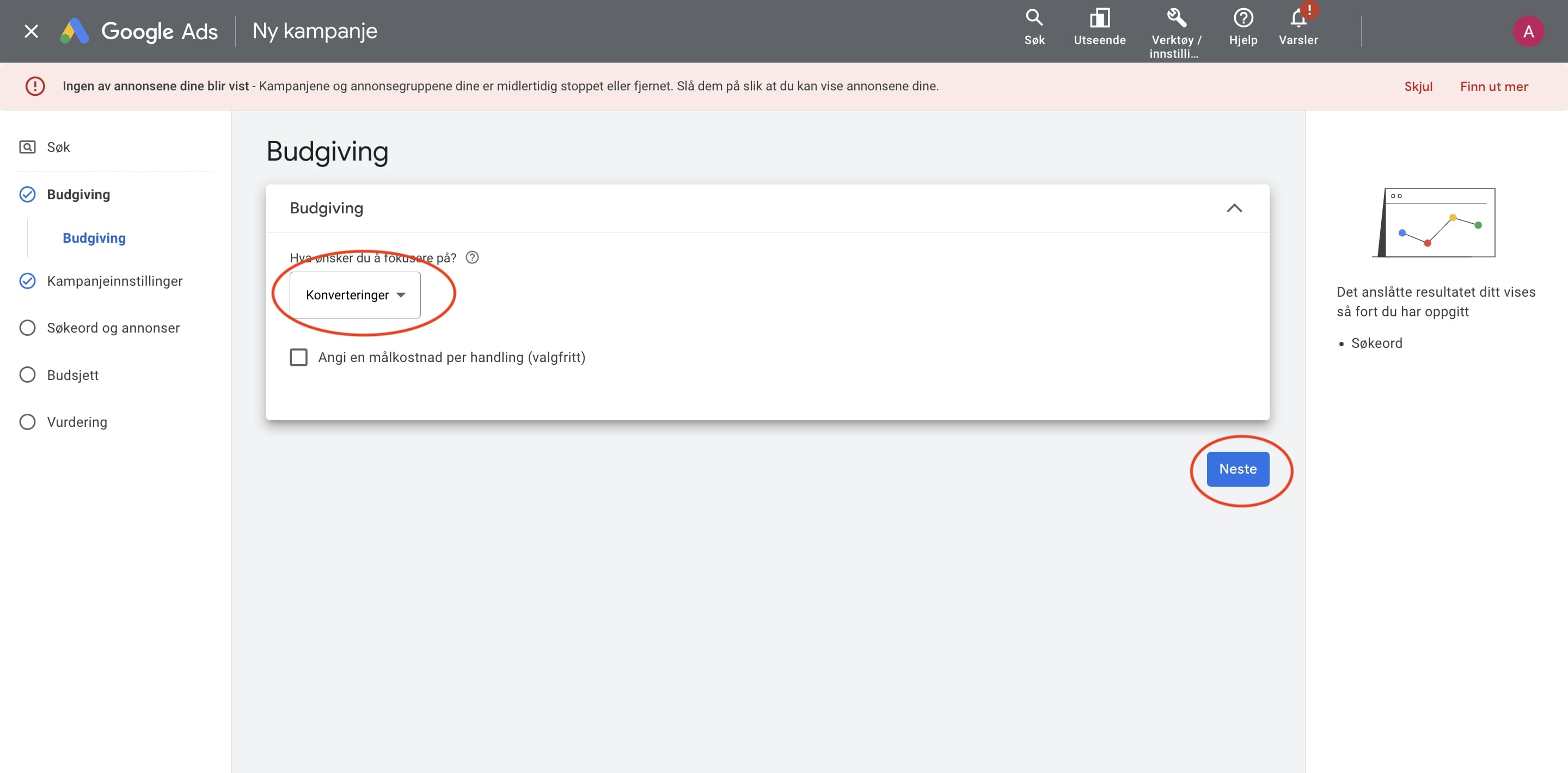 Har du byttet om budgivningsstrategi fra Konverteringer til Manuell CPC, kan du også følge det neste steget. Hvis ikke kan du hoppe videre til 6.1 Legge inn søkeord.