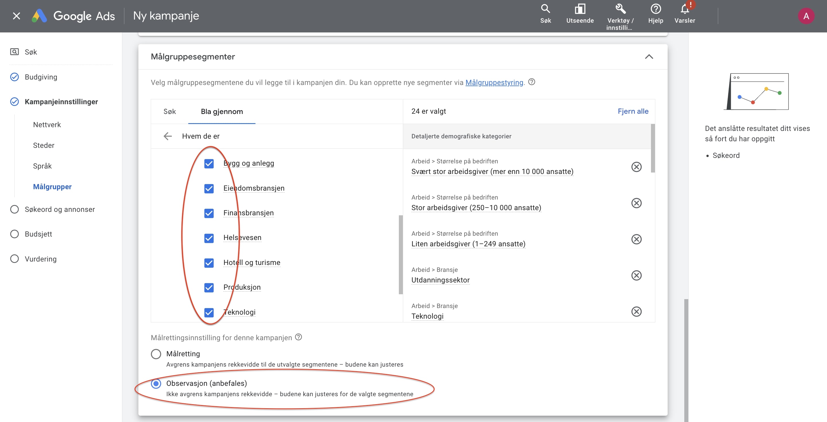 Blir målrettingsinstillingen huket av “Målretting”, vil kampanjen kun vise annonser til brukere som Google mener befinner seg i kategoriene som du har valgt. Ved “Observasjon” vil du derimot kunne vise annonsene til alle som søker etter søkeordene du har i kontoen din, men du får også mulighet til å se på data for de ulike målgruppesegmenter. Dette gjør at du for eksempel kan velge å by mer på de segmentene som du ser er ekstra lønnsom, eller at du kan lære mer om hvem kundene dine er.