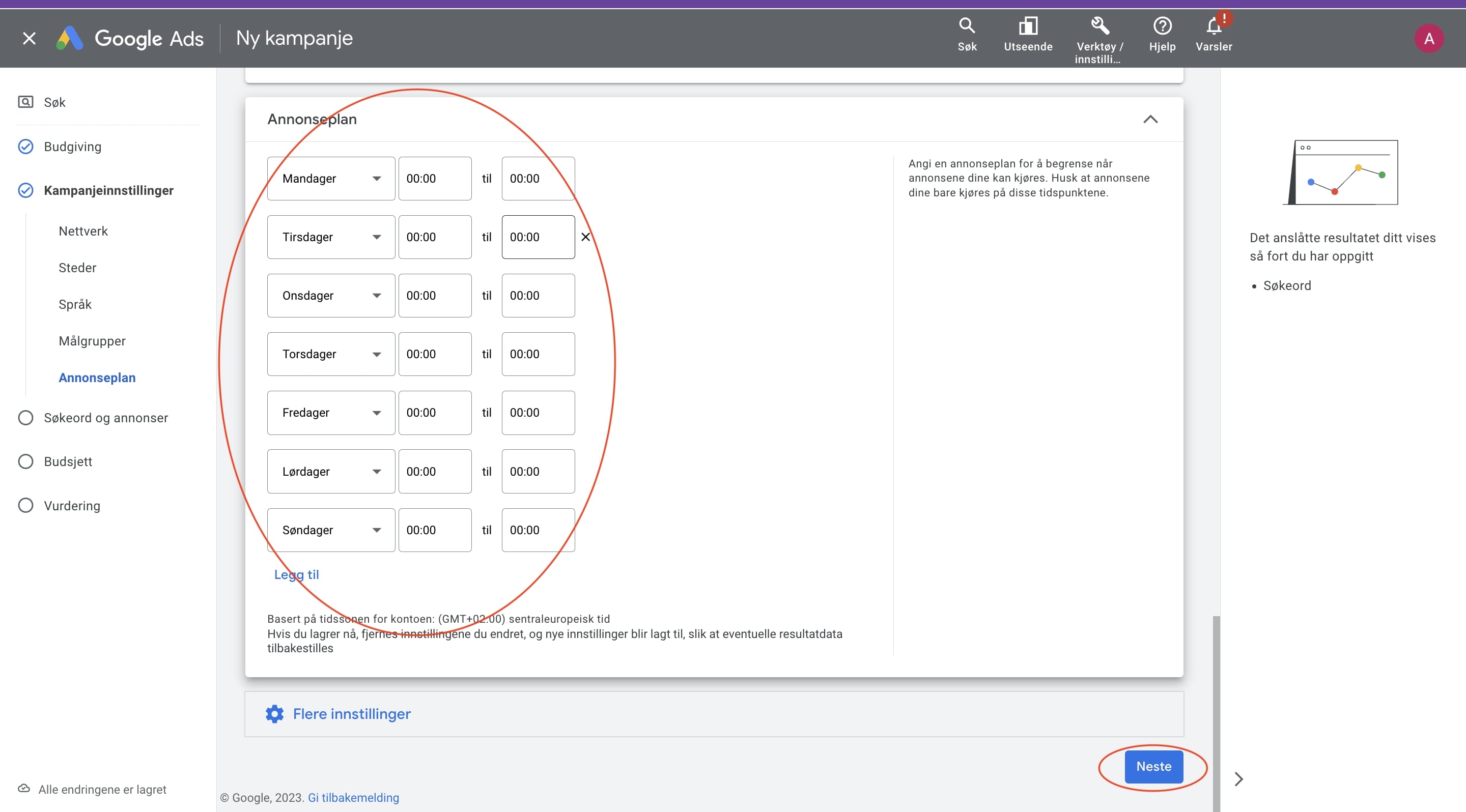 Som standard vil kampanjen kjøre alle dager. Om du skal annonsere hele døgnet og alle dager i uken, er det likevel lurt å legge inn hver enkelt dag. Grunnen til dette er at du da vil få mulighet til å se forskjell på resultater basert på dager. Etter hvert kan du også velge å justere opp budene dine på enkelte dager, hvis du merker at noen dager gir flere kunder enn andre.
