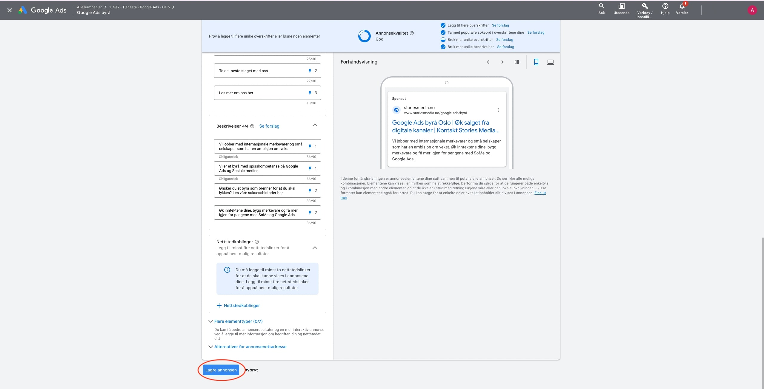 Underveis mens du utformer annonsetekstene dine, kan det være lurt å følge med på Annonsekvaliteten (se øverst i bildet ovenfor). Annonsekvaliteten er et mål Google Ads bruker for å vurdere hvor god annonsen er ut fra blant annet relevans og variasjonen i tekstelementene. Prøv å oppnå en “God” eller “Utmerket” vurdering, spesielt for de viktigste annonsene dine, da dette kan hjelpe med å oppnå bedre resultater.
