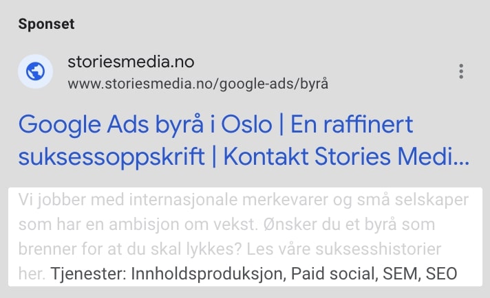 Beskrivelse 1 vises alltid, så sørg også for å få frem den viktigste informasjonen her. Inkluder også gjerne søkeordet her. Det er ikke alltid beskrivelse 2 opptrer i annonsen, men denne kan være flott for å presentere andre fordeler eller oppfordninger, for de som blir vist denne også.