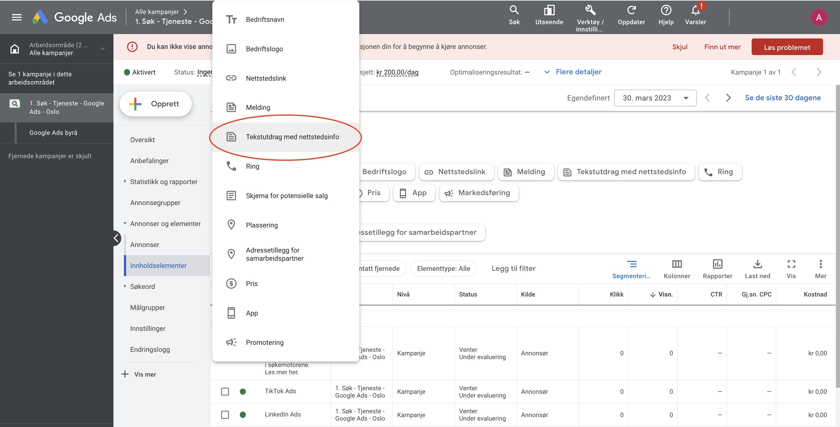 Det finnes flere typer innholdselementer. Du kan blant annet vise lenker til ulike sider på nettstedet ditt, telefonnummer, tjenester eller bilder. Selv om du legger til slike elementer i kampanjene dine, er det ikke alltid de vil bli vist. Om de blir vist eller ikke, er avhengig av om Google mener at elementene vil gjøre at annonsene dine presterer bedre og at du Annonserangeringen din er god nok. Det er likevel anbefalt å legge til slike elementer, da de både kan hjelpe deg med å overtale potensielle kunder om å trykke på din annonse og gi deg lavere klikkpriser.