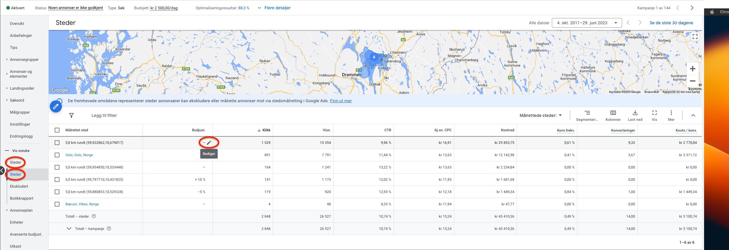Oftest vil man se at enkelte geografiske lokasjoner presterer bedre enn andre. Ser man at noen steder gir flere og rimeligere konverteringer enn andre, kan det derfor være lurt å legge inn budjusteringer på disse.