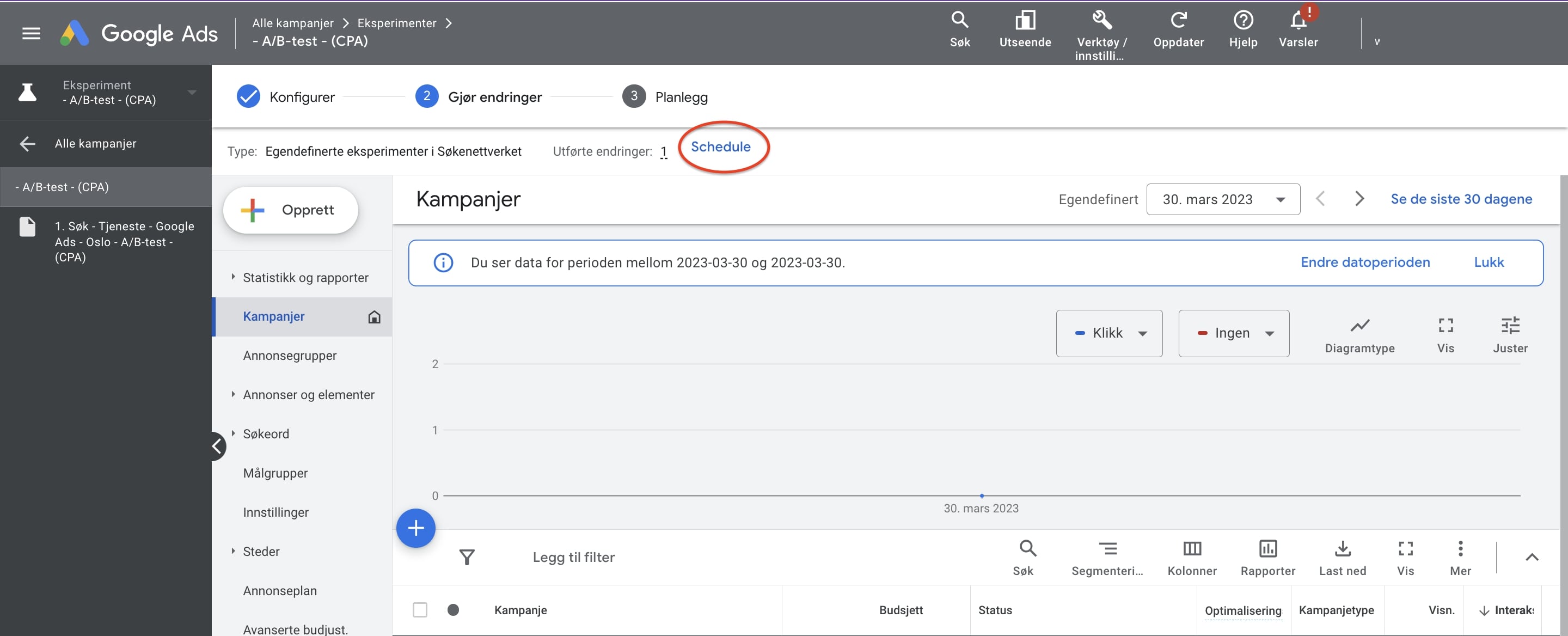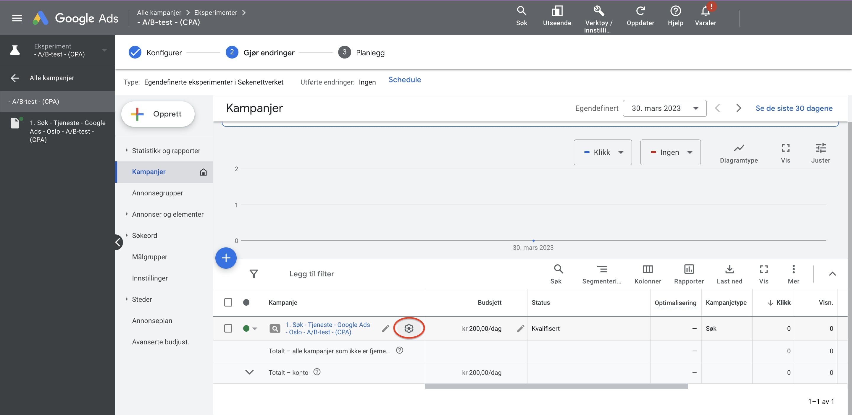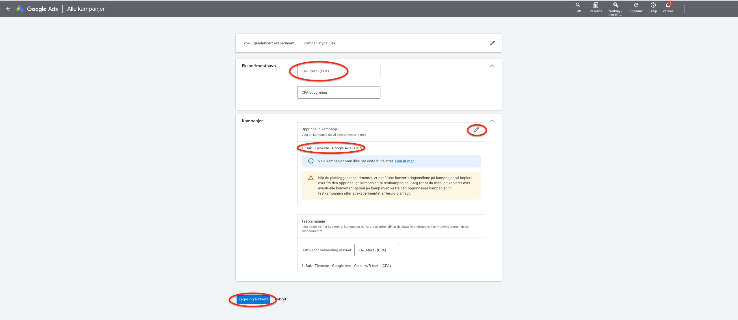 Det neste steget vil være å gjøre de endringene som du ønsker å teste. Her finnes det mange muligheter. Les gjerne denne artikkelen med tips til hva du bør tenke på når du skal kjøre eksperimenter i Google Ads.