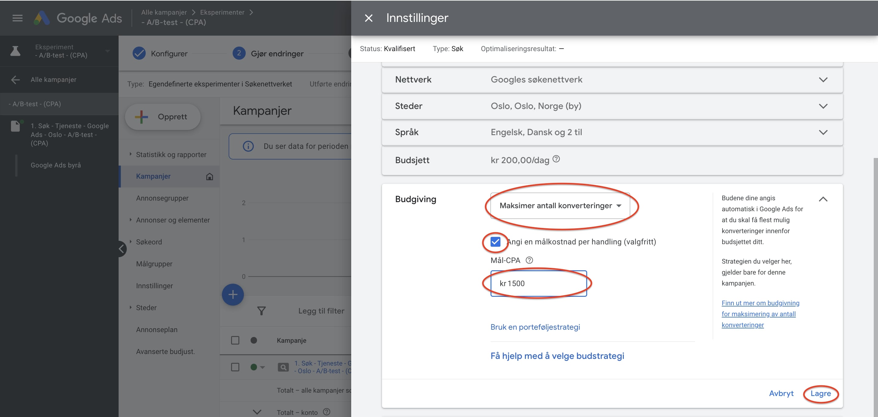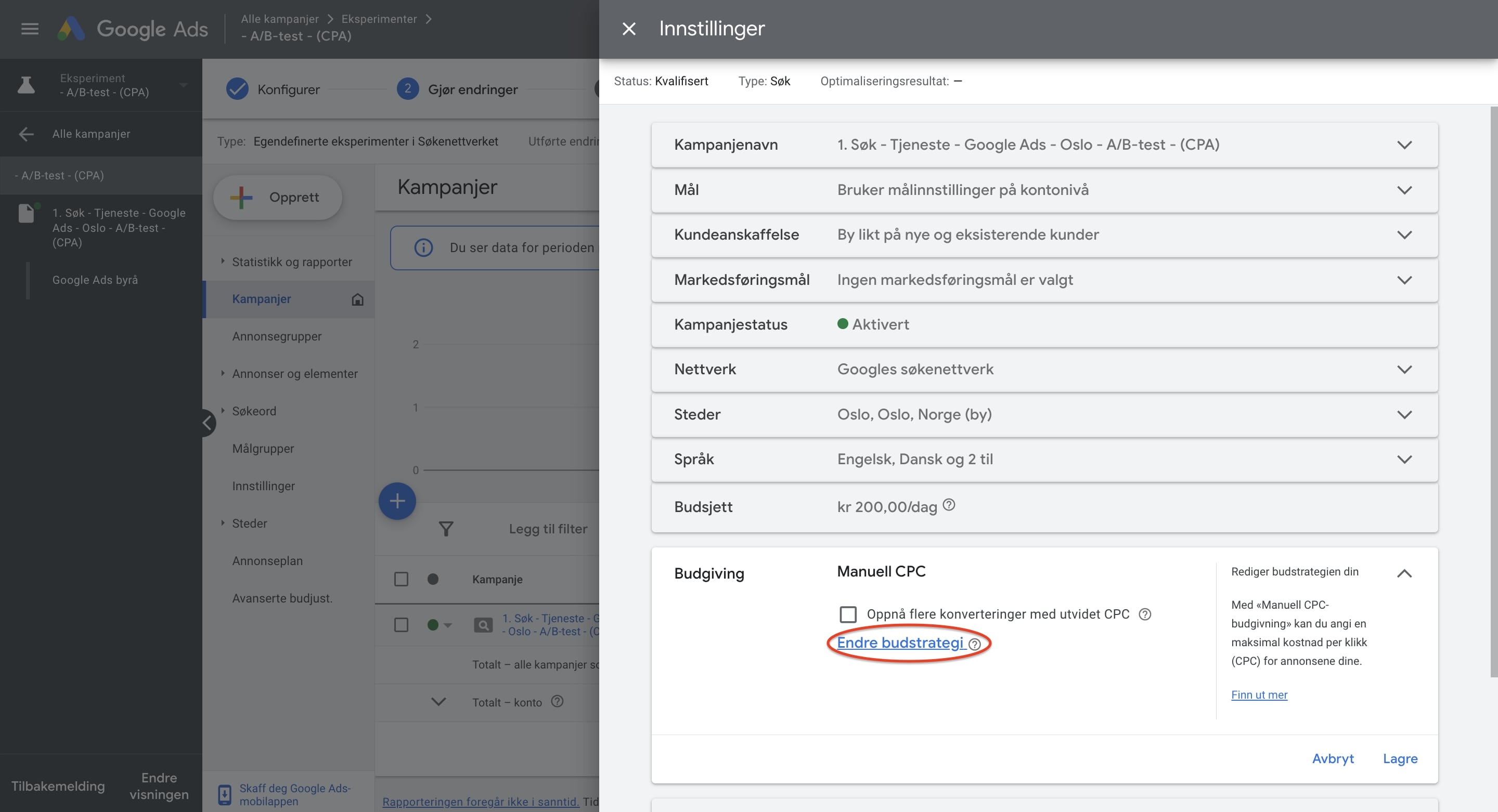 Derfor velger vi å gi eksperimentet navnet " - A/B-test - (CPA)". Da ser vi fort at dette er et eksperiment som kjører med mål-CPA-budgivning, mot den ordinære kampanjen som vi har kjørt på Manuell CPC.